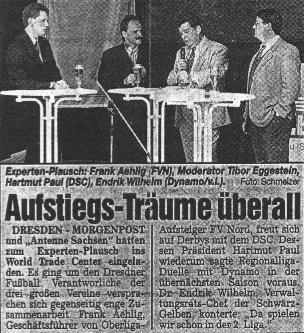 Festival", Moderation zur Dampferparade Oldtimer Rallye Dresden, Moderation am Autohaus Pattusch Dresden EM-Fußballwochen im World Trade Center Dresden, Interviews mit Chef``s der Dresdner Fußballvereine Beach Volleyballturnier Dresden, Prager Straße, Unterhaltungsmoderation 50 Jahre Unicef, Freilichtbühne "Junge Garde" Dresden, Co-Moderation, Mitwirkende: Nena, Die Prinzen, Puhdys |